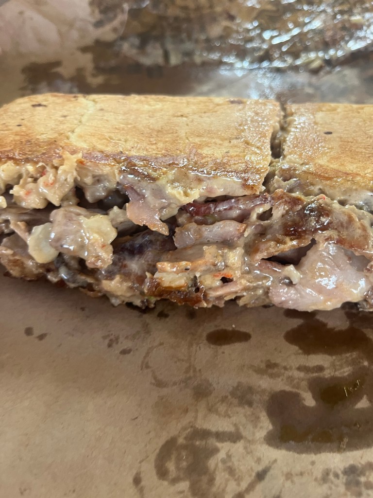 This proved to be one of the best culinary decisions of the trip so far. Bre and I both like to try local cuisine wherever we end up, and neither of us has spent much time in the gulf coast region, so we pretty much deferred to Will, our bartender, and ordered what he suggested. Will is a scientist, specializing in oyster habitat and rehabilitation, so our experience was colored by his knowledge. We “started” with a bucket of roasted oysters and and sandwich that I can only describe as an alligator cheesesteak. As the food started coming out, and because we were the only people at the restaurant, my attention was drawn across the bar to the very-active backyard smoker around the corner, and Will, who was enjoying his role as our culinary tour guide, encouraged me to go investigate.